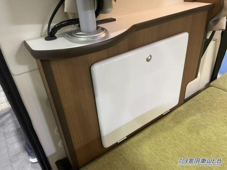 右の棚には折りたたみ可能なテーブルが設置されている。天井の収納スペースは、高さはないがあると便利なスペース。