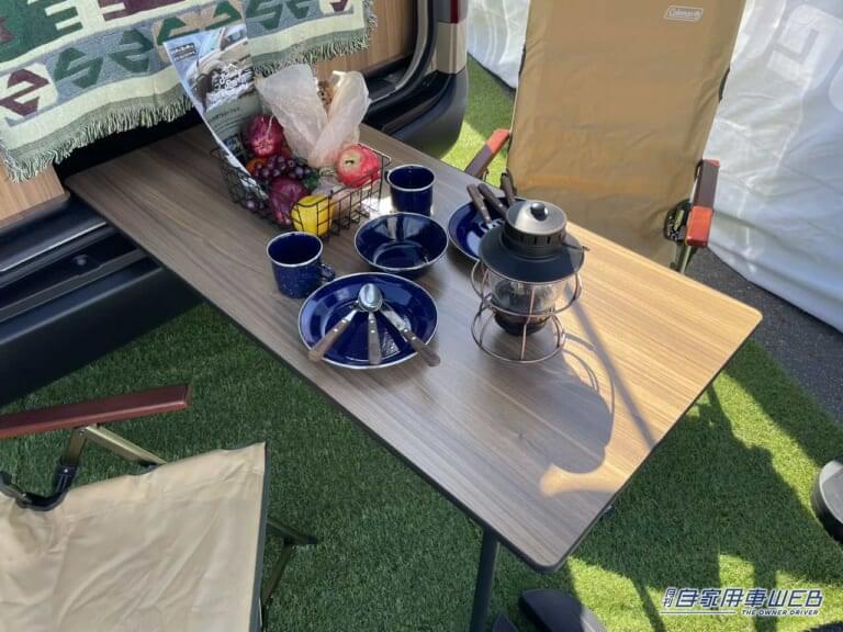 バックドアを開けると、車外で利用できるテーブルも展開可能。
