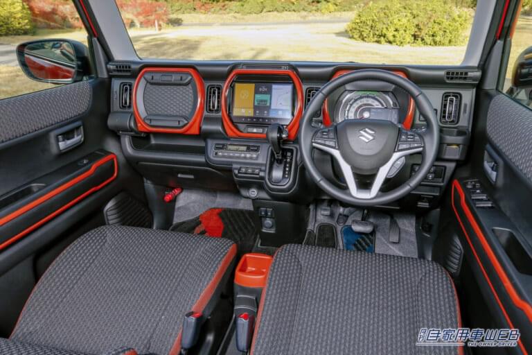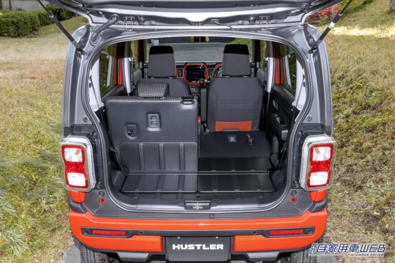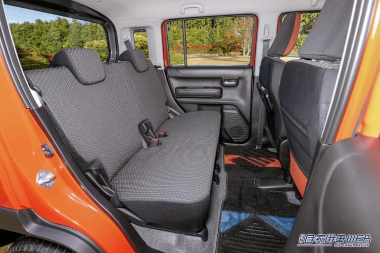 キャビンスペースや機能はワゴンRに近いが、荷室まわりは汚れや水分を拭き取りやすい防汚設計にするなど、アウトドアツールを積載しやすい仕様に変更していることも特徴。後席左右独立スライドシートを採用するなど居住性の高さも魅力のひとつで、男性の4名乗車も不足なくこなしてくれる。