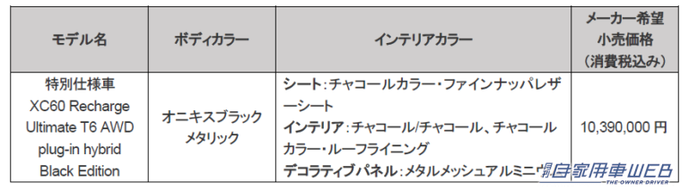 今回の特別仕様車は、シリーズ最高峰のパフォーマンスモデル「XC60 Recharge Ultimate T6 AWD plug-in hybrid」がベース。「オニキスブラック」のボディカラーと、チャコールカラーのシートカラーに特別なグロッシーブラックフィーチャーを採用し、ブラックカラーをテーマとしている。