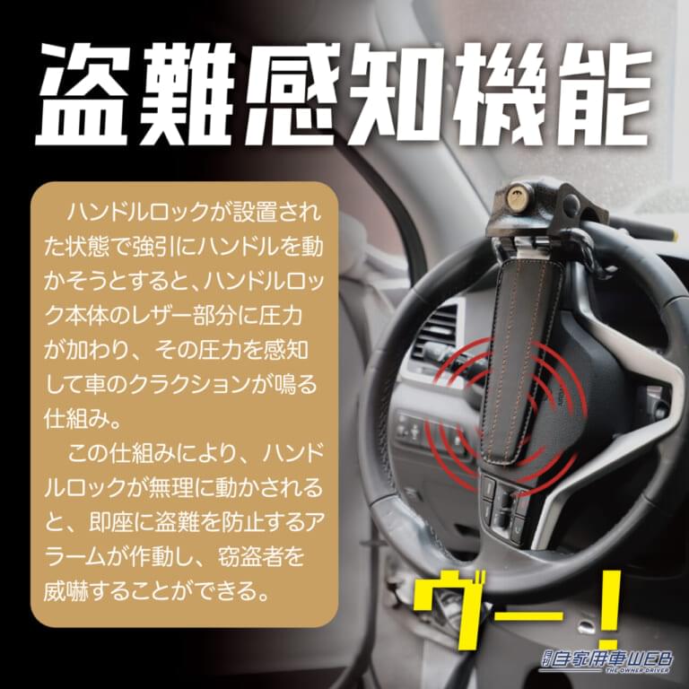 ハンドルロックが設置された状態で強引にハンドルを動かそうとすると、ハンドルロック本体のレザー部分に圧力が加わり、その圧力を感知して車のクラクションが鳴る仕組み。この仕組みにより、ハンドルロックが無理に動かされると、即座に盗難を防止するアラームが作動し、窃盗者を威嚇することができる。