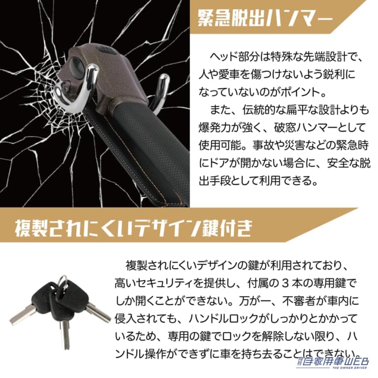 「Handle Lock」は、高品質の高硬度合金及び鉄鋼を採用し、普通乗用車と軽自動車に対応する。盗難感知機能や、緊急脱出ハンマー機能を搭載したユーティリティの高いセキュリティ製品となっている。