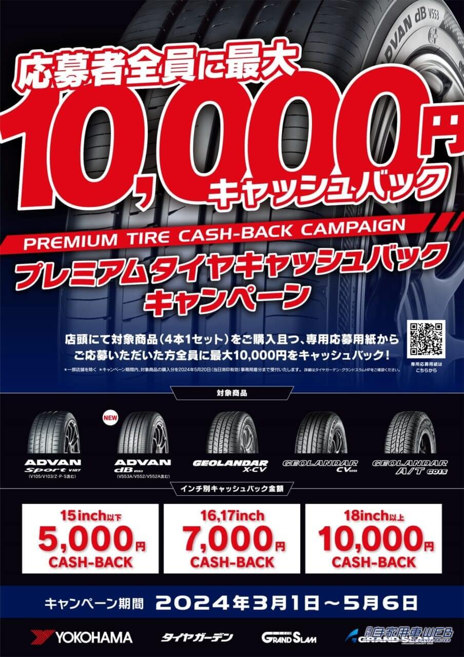 横浜ゴムは、自系列タイヤショップ「タイヤガーデン」「グランドスラム」にて「プレミアムタイヤキャッシュバックキャンペーン」を実施する。対象期間は2024年3月1日から2024年5月6日まで。