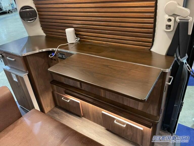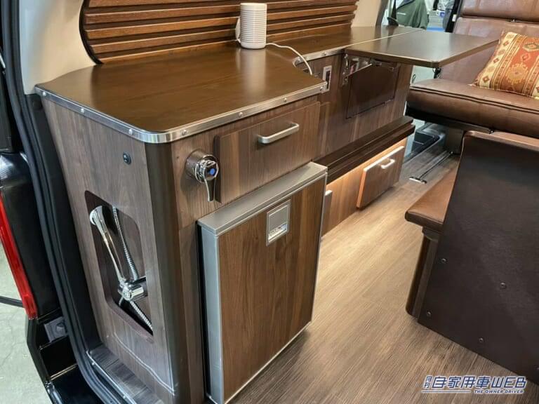 さらにバックドア側には冷蔵庫が埋め込まれているほか、車外で使用できるシャワーも取り付けられている。
