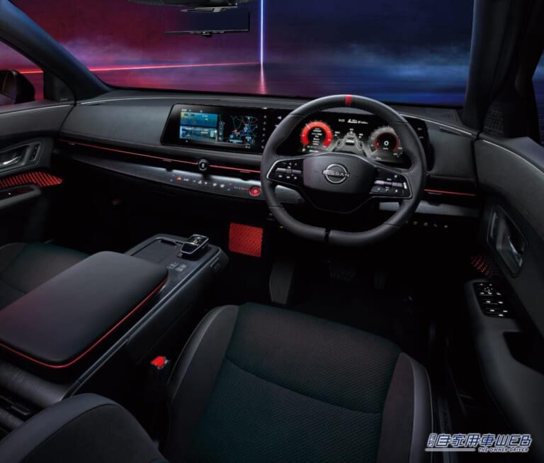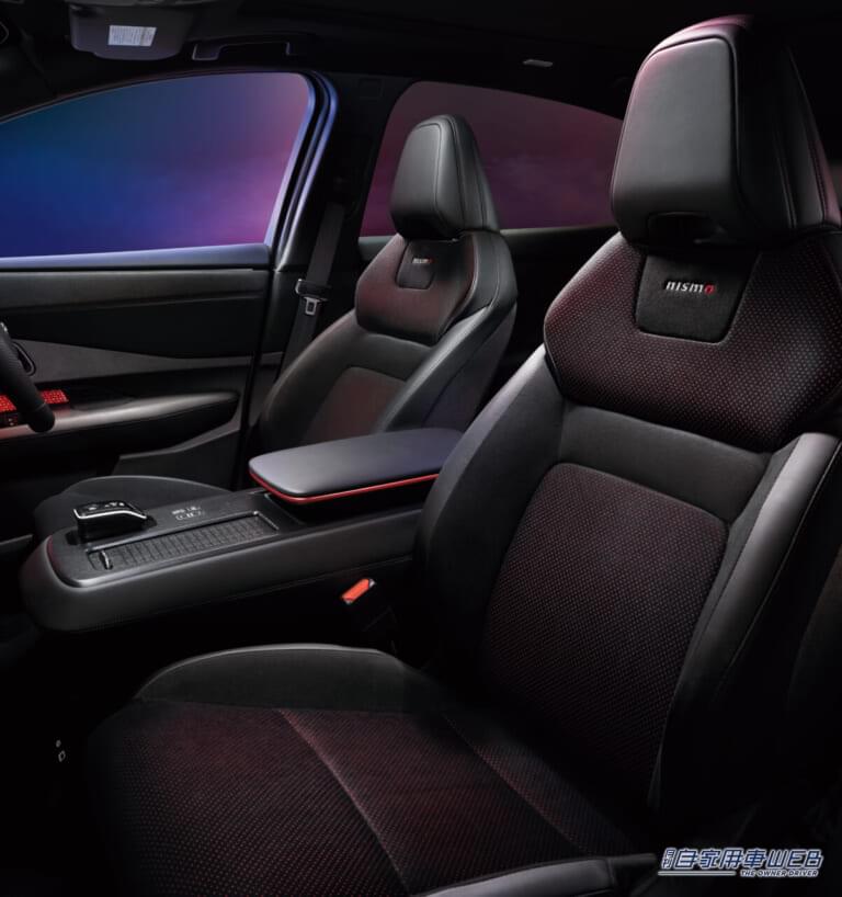 インテリアは、黒を基調とした中にスパイスの効いたレッドアクセントを配し、上質でスポーティーな空間となっている。スポーツ走行に合わせてホールド性とフィット感を高めた専用シートを採用し、車両との一体感を感じられる仕様で、NISMO専用BOSE Premium Sound System装着車でNISMOモードをオンにすると、フォーミュラEマシンのようなEVサウンドの演出により、高揚感のある走りが楽しめる。