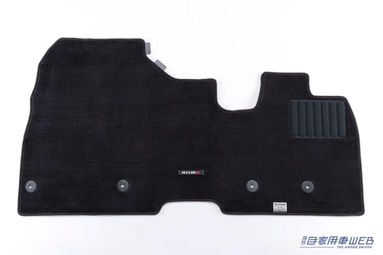 NISMOロゴプレートを配したスポーティ感と高級感あふれるフロアマット。固定用フック穴の位置・形状も純正品と同様のため、しっかり固定され、装着も簡単だ。また、走行時のズレを最小限に抑えるよう、マット裏面にフェルト素材を採用し、マットのズレを最小限に抑える。。プラットフォームに見合ったカッティングを施しているため純正なみにジャストフィット。マットの縁取りには長期間使用しても「反り」の起きにくいオーバーロック仕上げを採用している。