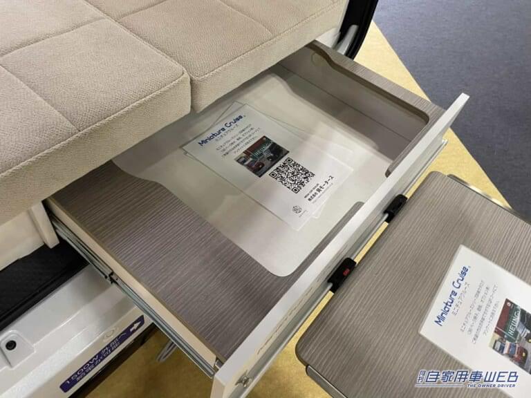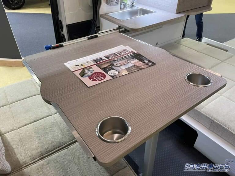 1列目のシートを倒して、可能な限り車内空間を広くしている。テーブルは可動式なので用途に応じて簡単に外すことができる。そのためシートの背もたれを動かせば、すぐにフルフラットにレアいうと変更可能だ。