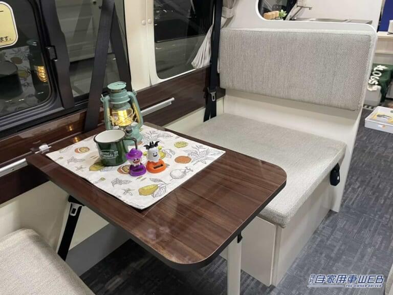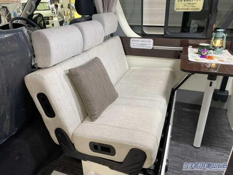 スライドドアの正面位はボックスシートが。前向き後向きどちらにも対応可能な2列目のシートは、クッション製も高く快適。テーブルは可動式なので用途に応じて簡単に取り外しできる。