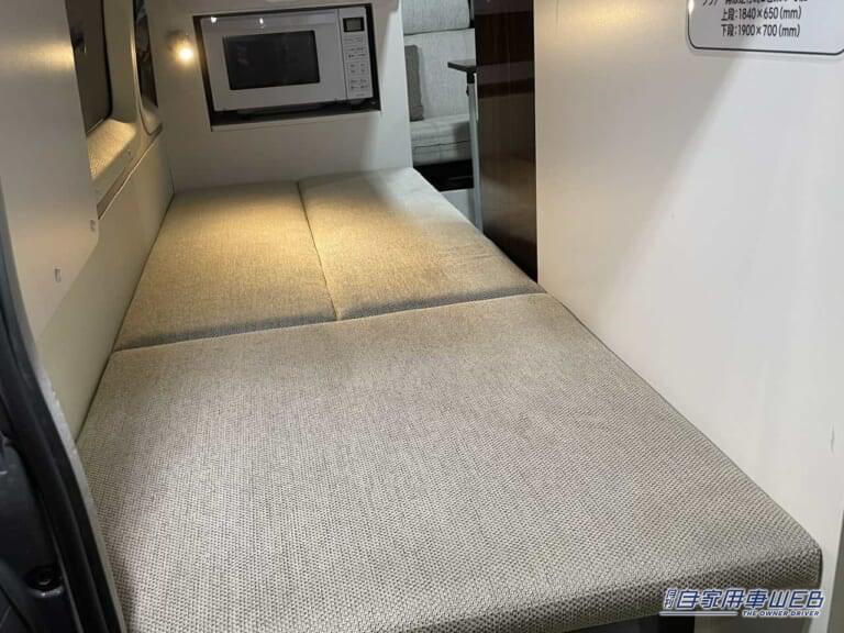 車内はベッドとリビングスペースがセパレートされた作り。就寝の際のレイアウト変更が必要ないので非常にラクだ。