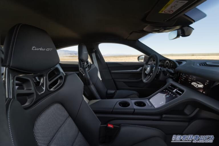 タイカンターボGTは、数多くのカーボンパーツにより、タイカンターボSに比べ最大75kgの軽量化に成功。Bピラートリム、ドアミラーのアッパーシェル、サイドスカートのインレイなどにカーボンファイバーが使用され、CFRP製のフルバケットシート、軽量ラゲッジコンパートメント、テールゲートの電動ソフトクローズ機能の削除も軽量化に寄与している。