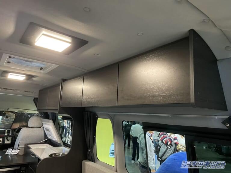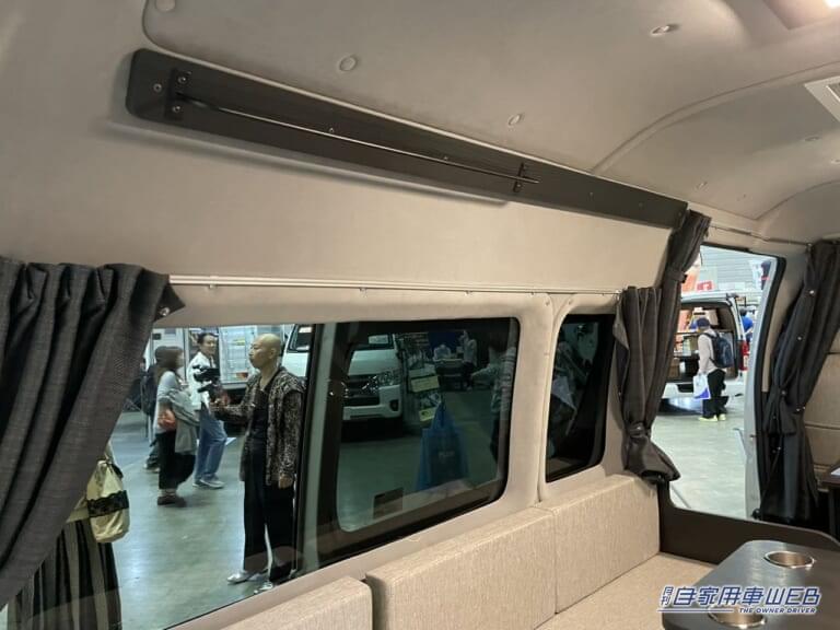 左側上部にはサイドバーが設置されているので、衣類やギアをかけるには便利、窓にはカーテンも付いている。右側上部には収納棚が設置されている。ひとつひとつが大きいので、収納力は抜群だ。