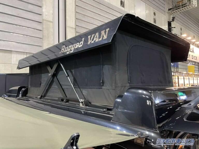 バンパーマウントキャリアを装備しており、車内に積みきれない荷物はこちらにも積載可能。また、サイドオーニングサイドオーニングのような形でタープを設置すると、車と一体になったベースキャンプが完成する。