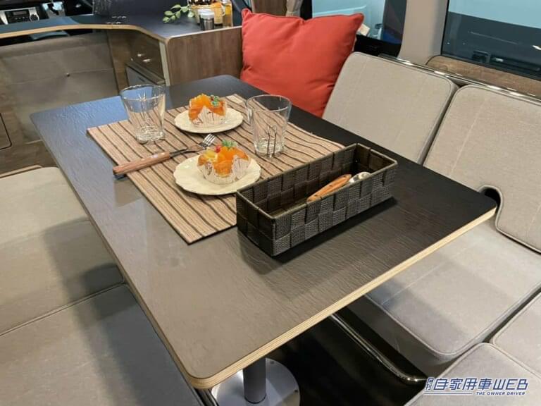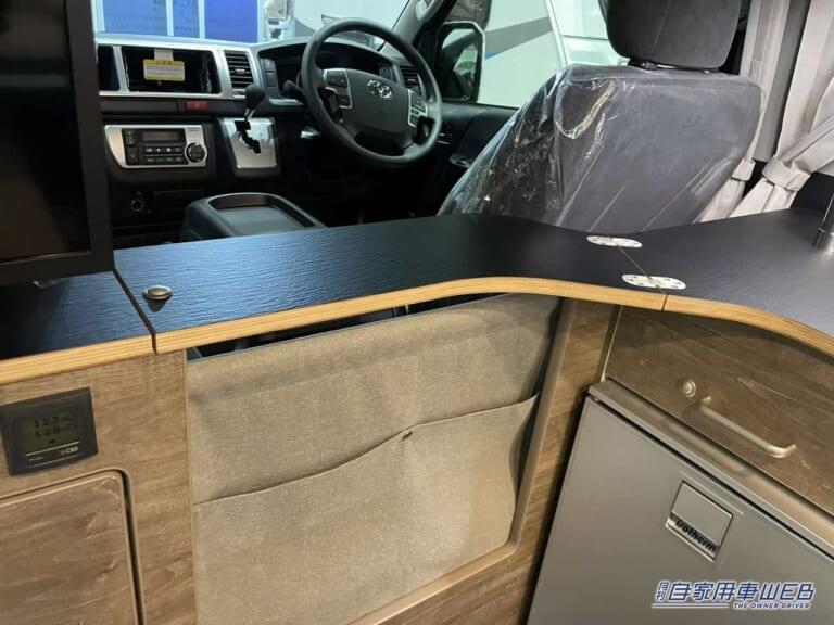 運転席と助手席の間のカウンターの天板は跳ね上げられるウォークスルー構造となっており、後部への移動がラク。