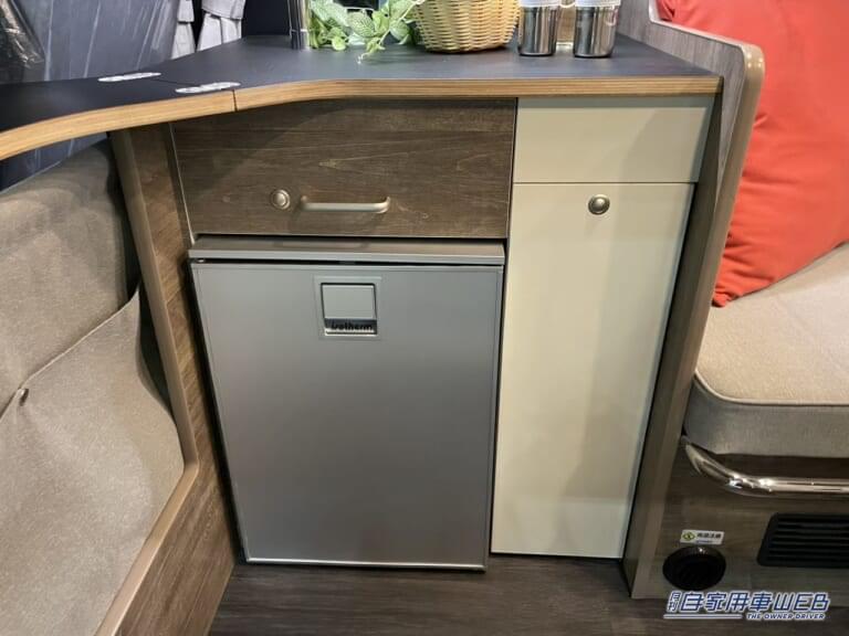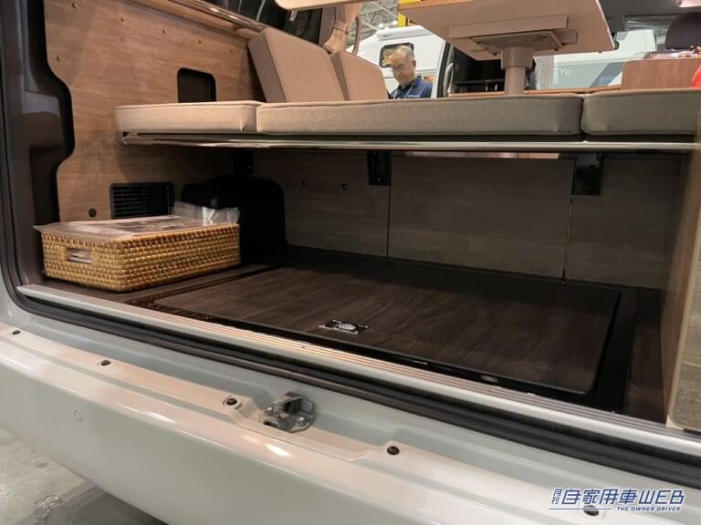 テーブルにはシンクが埋め込まれておりので、車外で水を使う際にも利用できる。カウンター下は収納スペースとなっているので、アウトドアギアなどはこちらに積み込んでおくことができる。