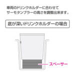 また、付属のスペーサーを使用することで、車両のドリンクホルダーのサイズに合わせた調整が出来る。