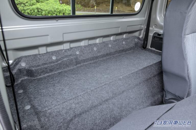 ビックキャビンの恩恵はスペースの余裕に現れる。普通の軽トラだとシート後ろに余裕はないが、スーパーキャリーは相応のスペースが確保されている。頭上にもオーバーヘッドシェルフが設置され、ここにも荷物を収めることが可能。