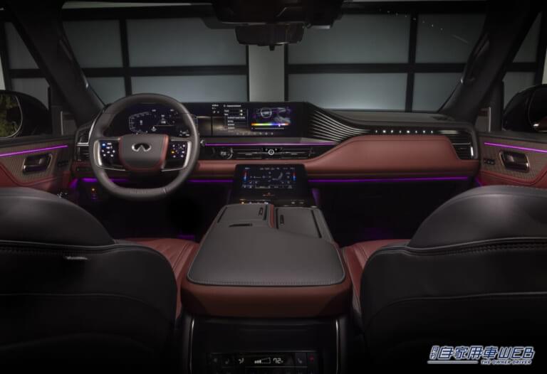 装備機能も、ININITIとして初となる、高速道路においてハンズオフドライブを可能とする「プロパイロット アシスト 2.1」を採用。ほかにも天井に組み込まれた赤外線センサーが乗員の体温を検知し、温度と風量を調節して2列目に快適な空気を送り込む「バイオメトリック クーリング」や、車体前方側面の様子を2個の14.3インチディスプレイに表示できる「フロントワイドビュー」、フルサイズのラグジュアリーSUVセグメントでは初となる「クリプシュ プレミアムオーディオシステム」を搭載している。