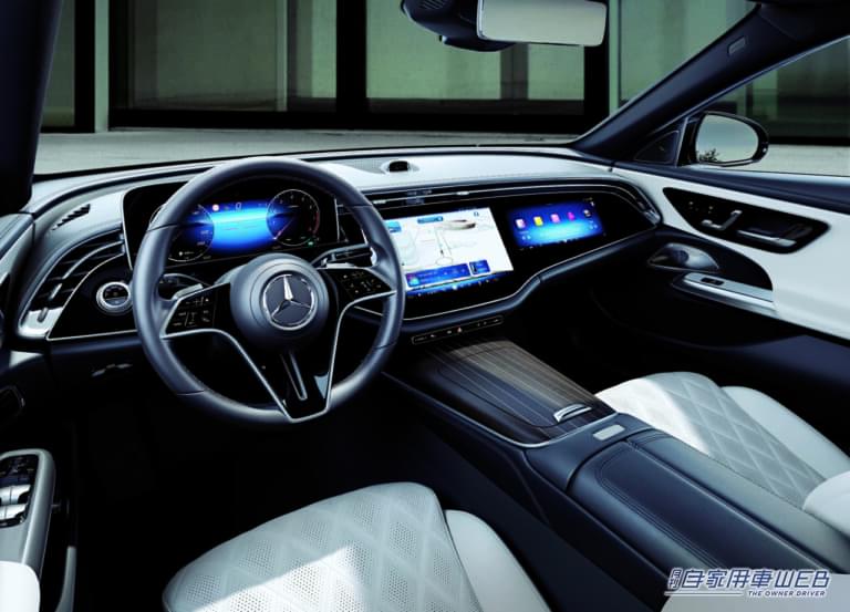 インテリアには、他のEクラスと同様にトリムパネルがダッシュボード中央まで伸びており、センターディスプレイが浮かんでいるように見えるデザイン。また、オプション設定の「MBUX スーパースクリーン」(助手席一体型ディスプレイ)を搭載している場合、大型ガラス面がセンターから助手席まで広がるデザインとなる。