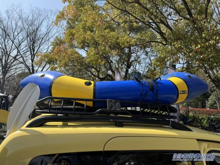 また、ルーフキャリアには、折りたためるカヤック「パックラフト」も積まれていた。