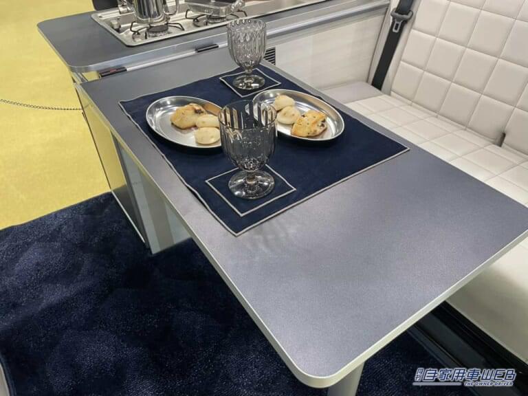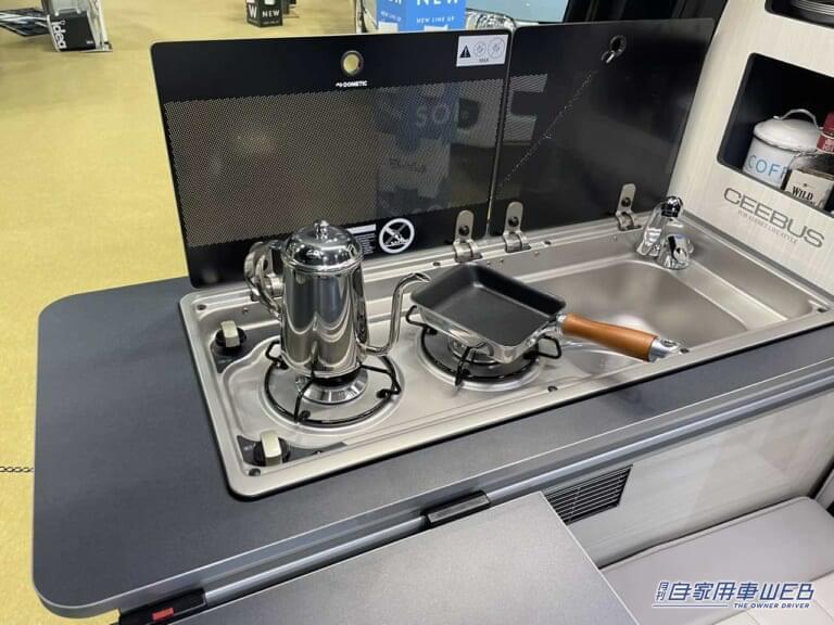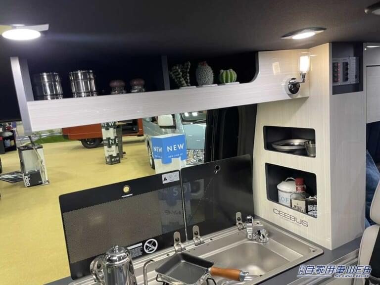車内右側にはキッチンカウンターが設置されている。シンクとコンロが埋め込まれており、調理には万全の体制が整っている。サイドや上部には食器や調味料などを入れるのに便利な棚が備わっている。