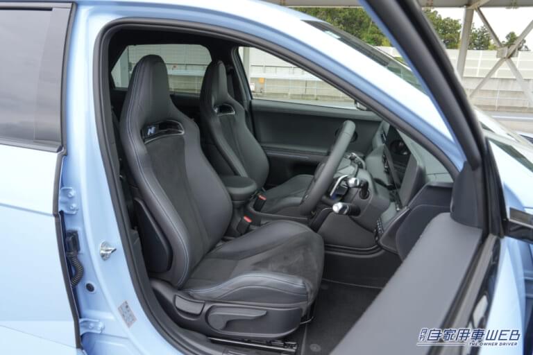 フロントシートはフルバケット型ながらリクライニングとシートリフターも備わり、スポーツシートとしては乗降性も良好。リヤシートも左右独立スライド機構を備えているなど、上級モデルらしい贅沢な仕様になっている。