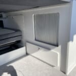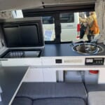 車内右側にはシンクと冷蔵庫が埋め込まれたキッチンカウンターが設置されている。