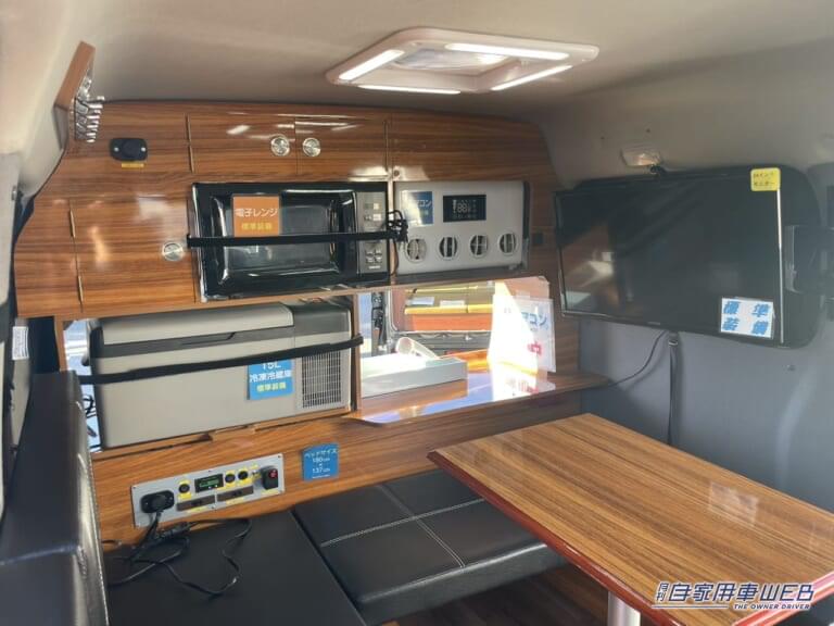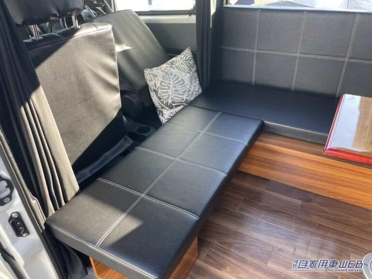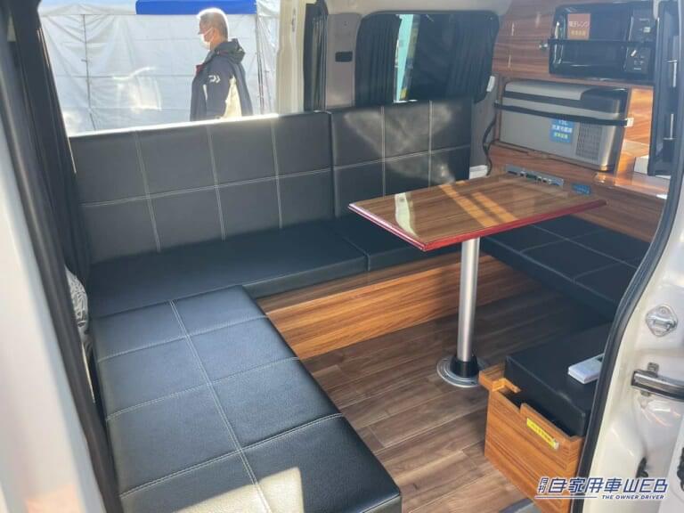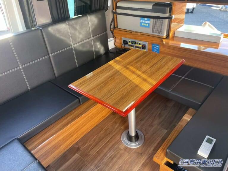 シートには黒のレザー調の生地が採用されている。高級感もあり、水や汚れに強いため、キャンピングカーには最適だ。中央に置かれたテーブルは取り外し可能となっている。そのためテーブルと背もたれを動かせばフルフラットへの変更も簡単。