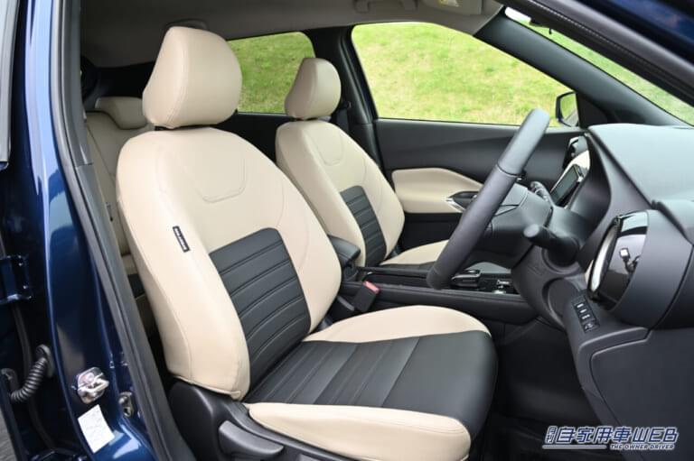 ノート譲りの広いパッケージにより、後席まわりも十分な余裕が確保されている。マイナー時に人気グレード「ツートーンインテリアエディション」のカラーは、従来のオレンジタンに加えてベージュ(写真)も追加された。
