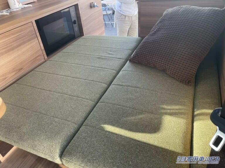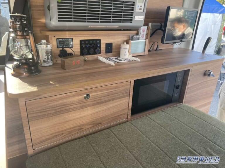 後部はフラットシートとなっており、子供は横になって寝ることもできる広さ。カウンターに設置された電子レンジは、フルフラット状態でも使うことができる高さに配置されている。