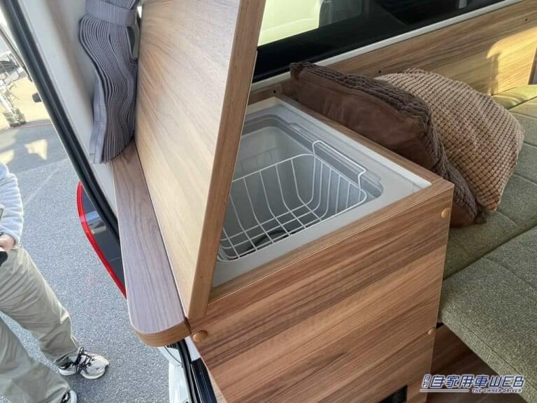 左の窓にはカーテンが設置されているのでプライベート空間の確保は問題なし。バックドア側手前にあるのは冷蔵庫。購入した食材をバックドア側から入って収納できる位置。また、木目の素材で覆っているので、インテリアとして車内に溶け込んでいる。