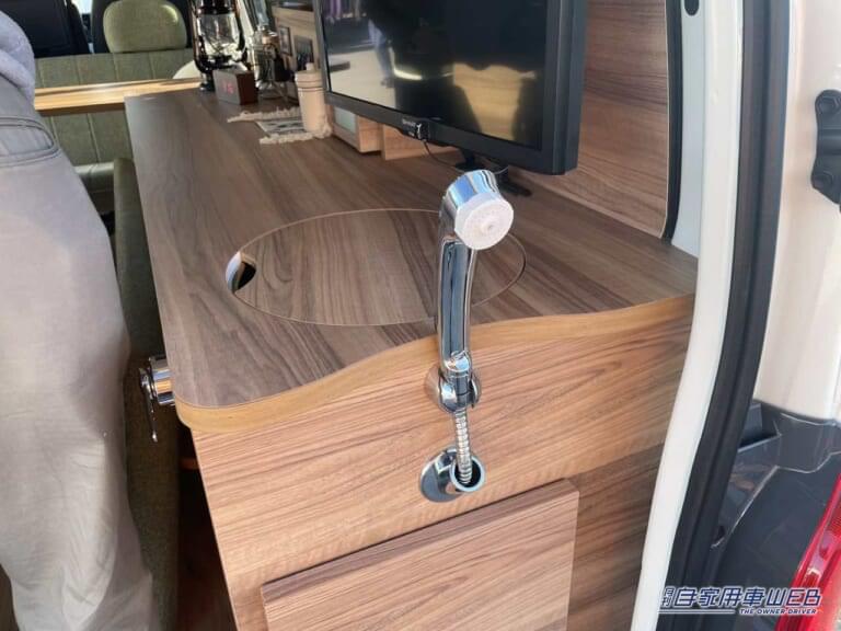 シンクはバックドア側に配置されているので、車外で水道を使うこともでき非常に便利。