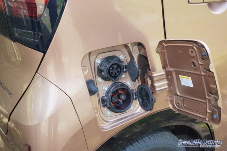 自宅充電ならおおよそ8時間で100%充電が可能。出先で便利な急速充電にも対応している。30kWの急速充電器なら約40分間でおおよそ80%の充電量が確保される。充電ポート口は上が普通充電、下が急速充電。