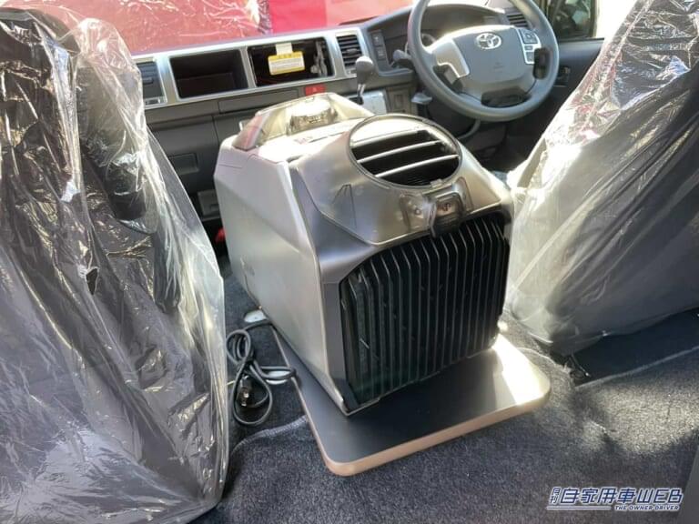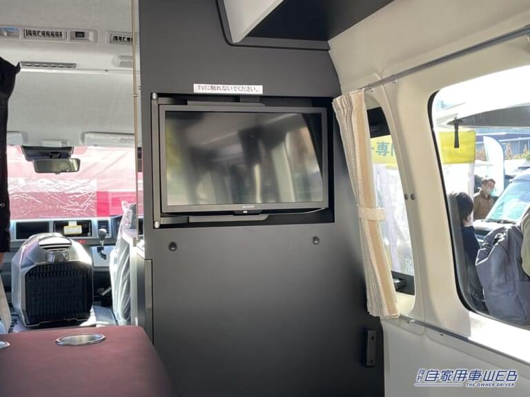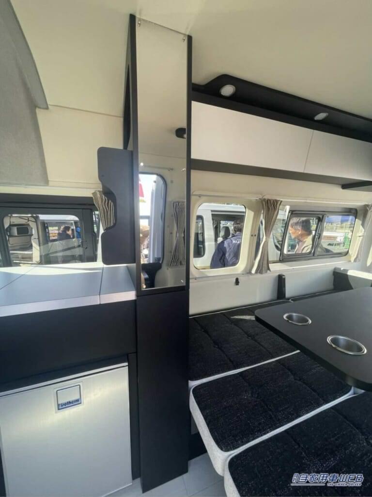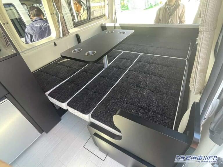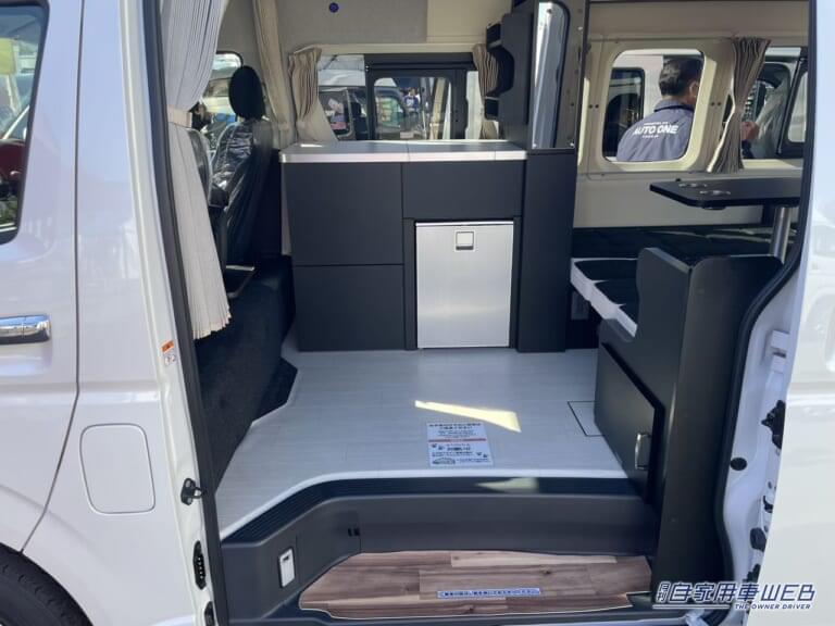 運転席裏にあるキッチンカウンターには冷蔵庫が埋め込まれており、右には棚も設置されている。センターコンソールはフラットになっており、スポットクーラーなどを置くことも可能だ。