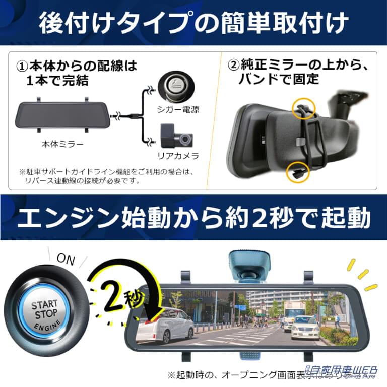 デジタルミラー本体は、9.3インチ液晶のタッチパネル式。純正ミラーにかぶせ、ゴムバンドで固定するタイプのため、車種を問わず、簡単に設置することができます。また、本体からの配線も、リアカメラとシガー電源につなぐだけで使用できる簡単配線です(※1)。お車のエンジンを始動すると約2秒で本体が起動、すぐにお車後方の状況を確認できる便利なクイックスタート機能を搭載しています。 ※1 駐車サポートガイドライン機能をご利用の場合は、別途 リバース連動線の接続が必要です。