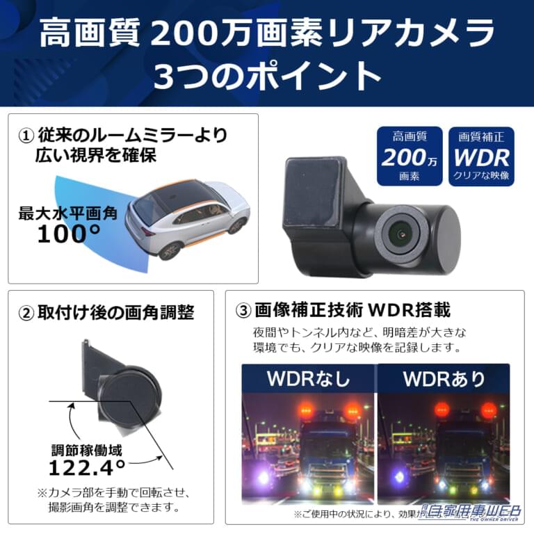 付属のリアカメラは200万画素の高画質。純正ミラーよりも広い最大水平画角100°を確保し、