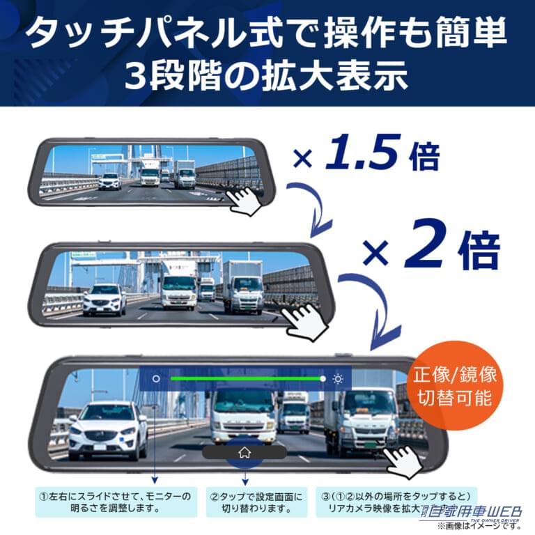 本体ミラー画面はタッチパネル式で、①明るさ調整 ②詳細設定 ③画面拡大表示などの操作を簡単におこなうことができます。
