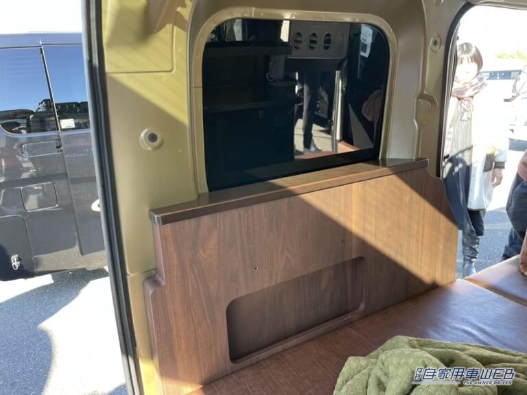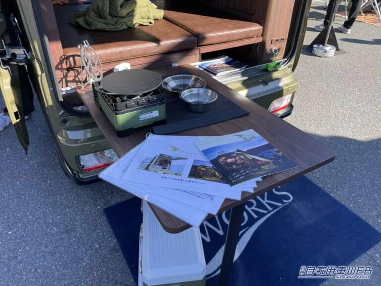 後部から車外に展開できるテーブルは、調理などをするには最適なスペースとなる。
