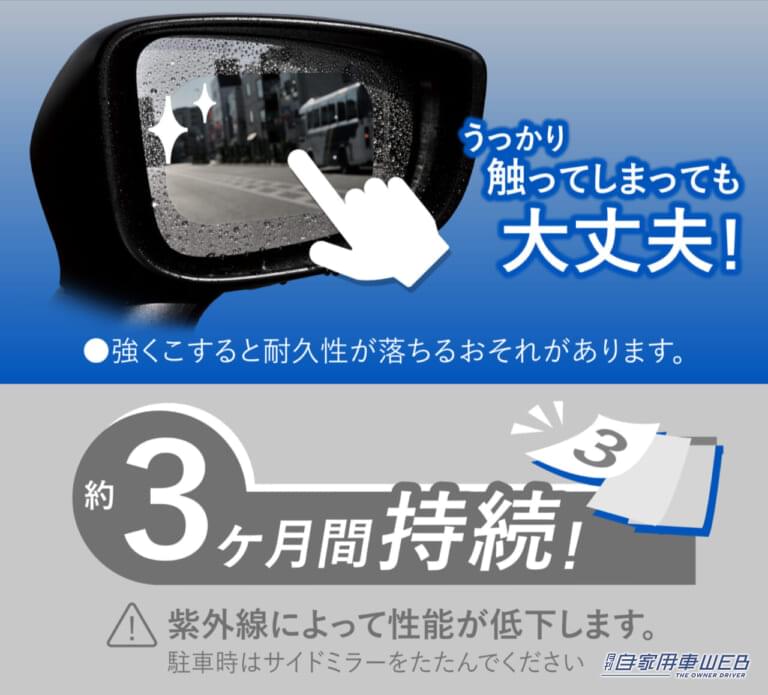 サイドミラーに貼ることで、停車中も雨を弾いてくれる。風があたりにくいサイドミラーでも雨粒が残らず、後方を見やすく保つことができる。