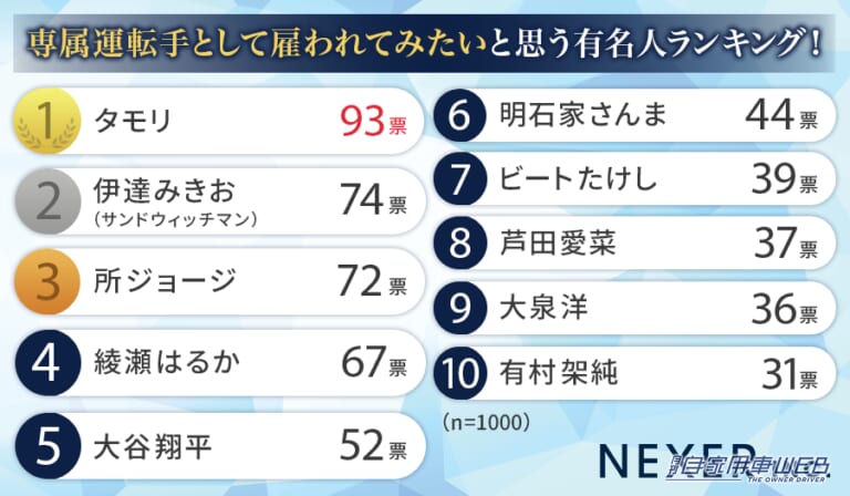 株式会社NEXERは、役員運転手派遣・社長秘書派遣の株式会社トランスアクトと共同で「専属運転手として雇われてみたいと思う有名人」に関するアンケートを実施し、結果を公開した。
