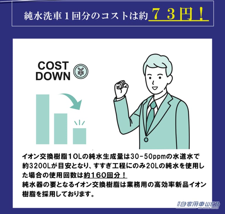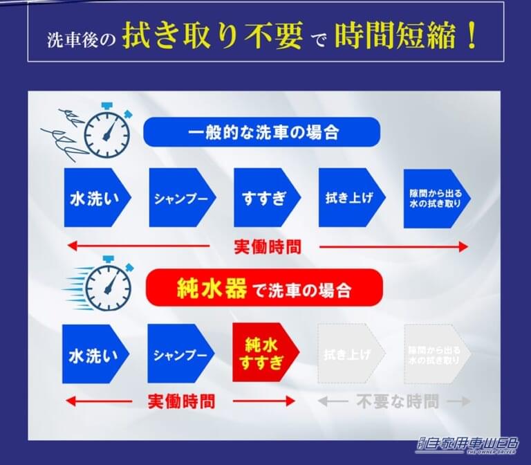 洗車の大部分の時間を占める面倒で神経を使う水の拭き上げ工程も、純水洗車の場合は省力が可能となる。洗車はしたいけどなかなか時間に余裕のない人や、愛車を長く綺麗に保ちたい人にオススメだ。