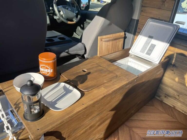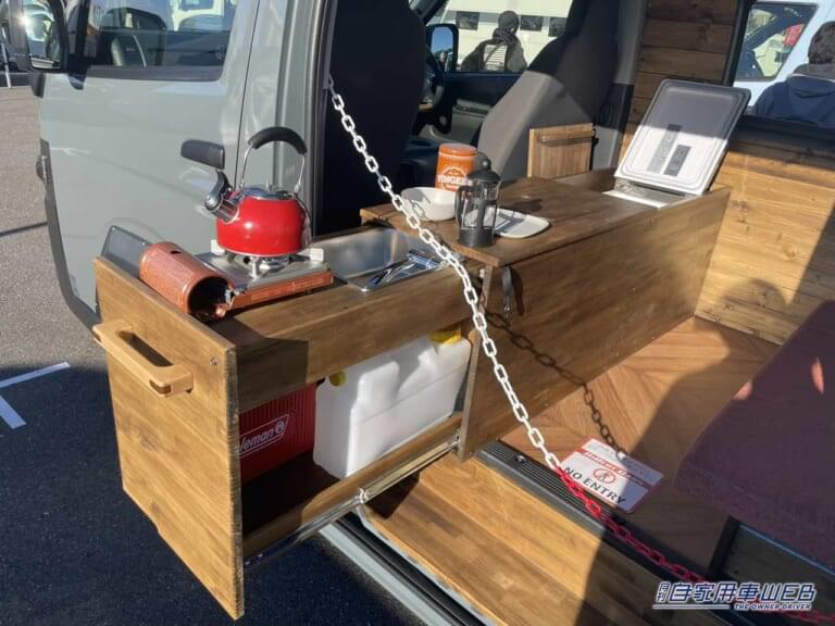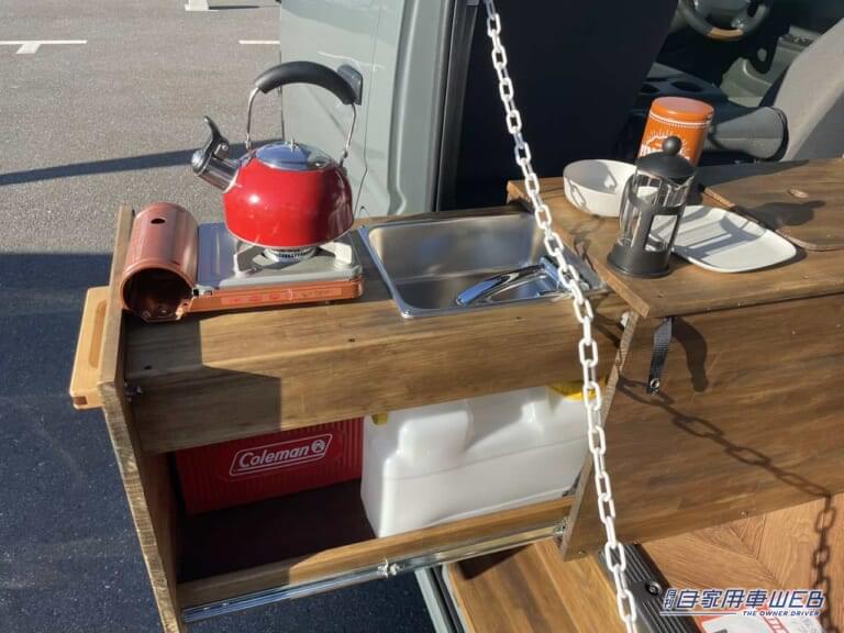 車内前部にはスライド式のキッチンカウンターが設置されている。