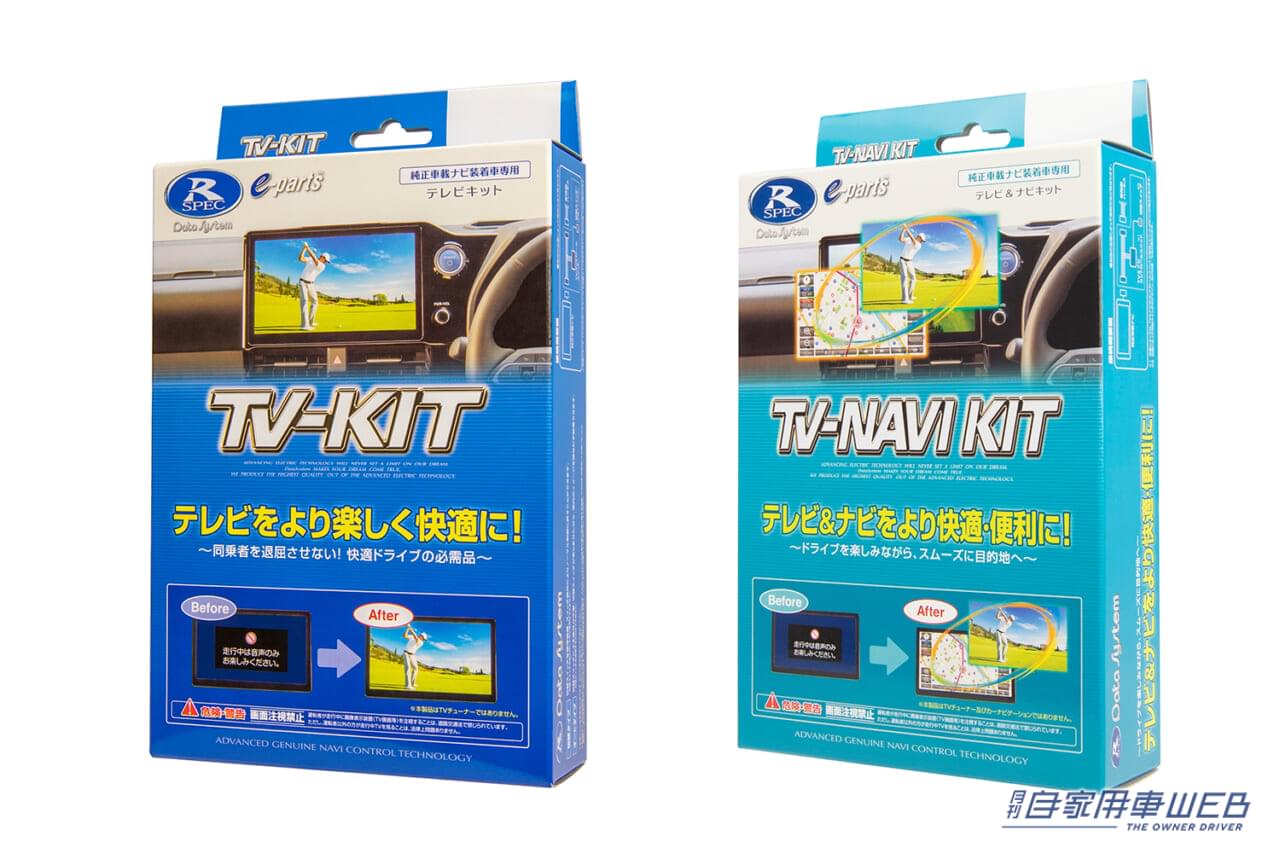 TV-KITは、付属のスイッチでテレビ視聴機能をオン/オフできる切り替えタイプ(HTV409)とオン/オフスイッチの無いオートタイプ(HTA609)、TV-NAVIKITは切り替えタイプが用意される。