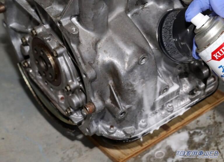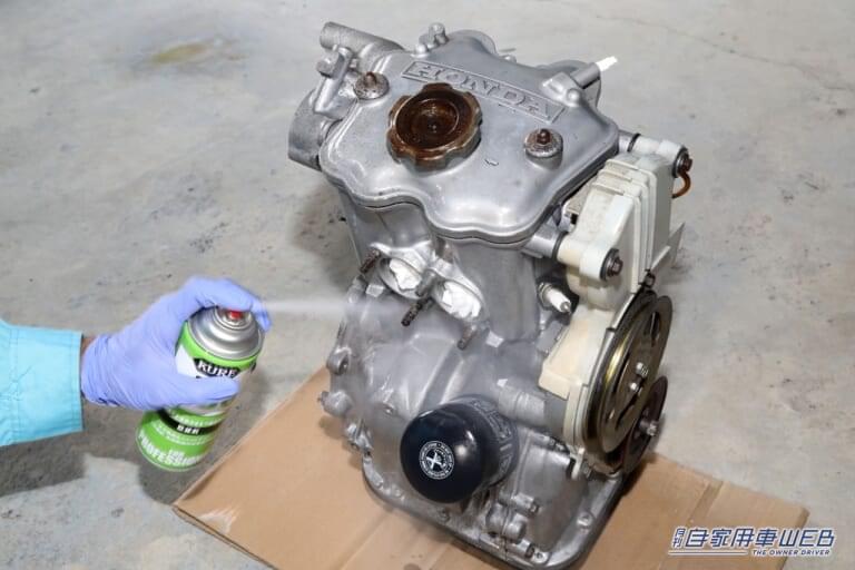 エンジン全体に防錆剤の3-36をスプレー。浸透力も高いので、スプレーするだけで防錆被膜を形成して腐食を防止してくれる。樹脂パーツやゴムパーツにはかからないように注意しよう。
