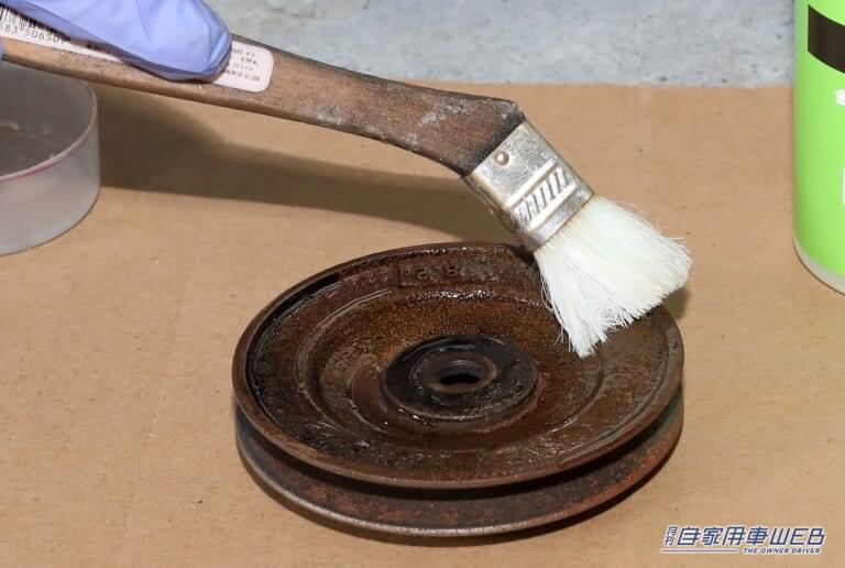 油汚れの上にホコリが堆積して、全体的に汚れてしまったエンジン。湿気のせいでホコリがこびり付いてしまい、カビまで生えてしまった。そこでクリーナーをスプレーしてブラシでゴシゴシ。錆の酷かったプーリーは錆び取り剤でしっかり錆を除去しておく。