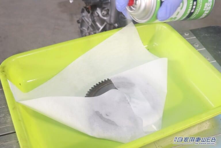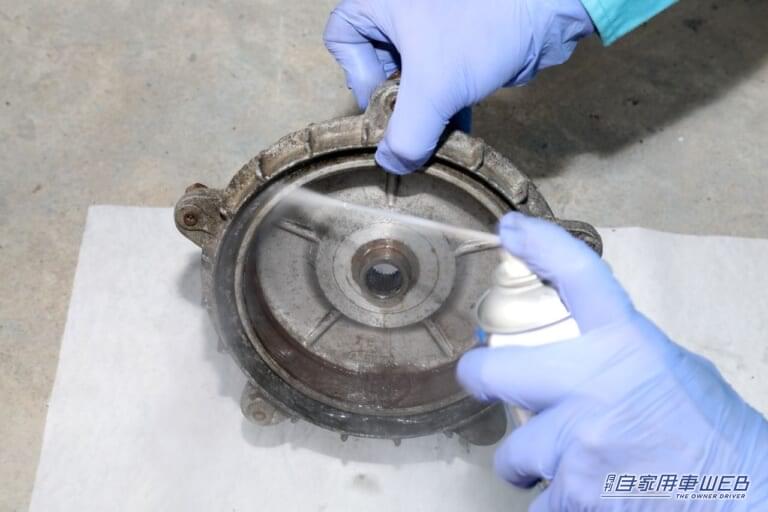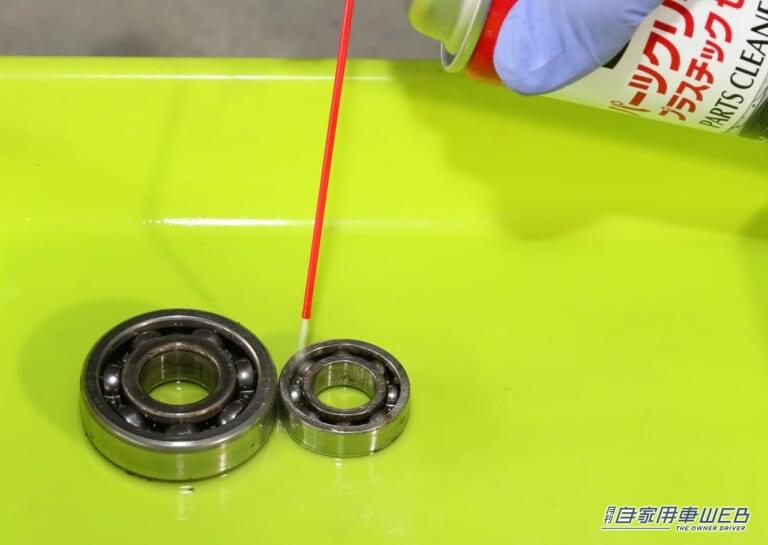 まずはパーツクリーナーで汚れ落とし。樹脂類にも使えるタイプを使用すれば、ペンチやドライバーなどの樹脂部分の汚れを落とすこともできて便利。