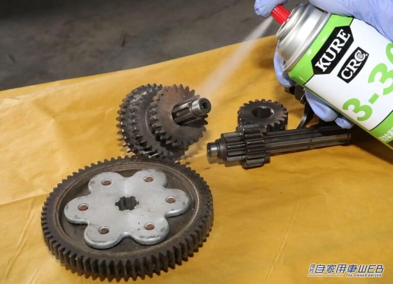 3-36 には清浄効果があるのでちょっとした汚れならばスプレーするだけで落とすこともできる。ギヤやベアリングなどにも躊躇なく使うことができることも魅力だ。