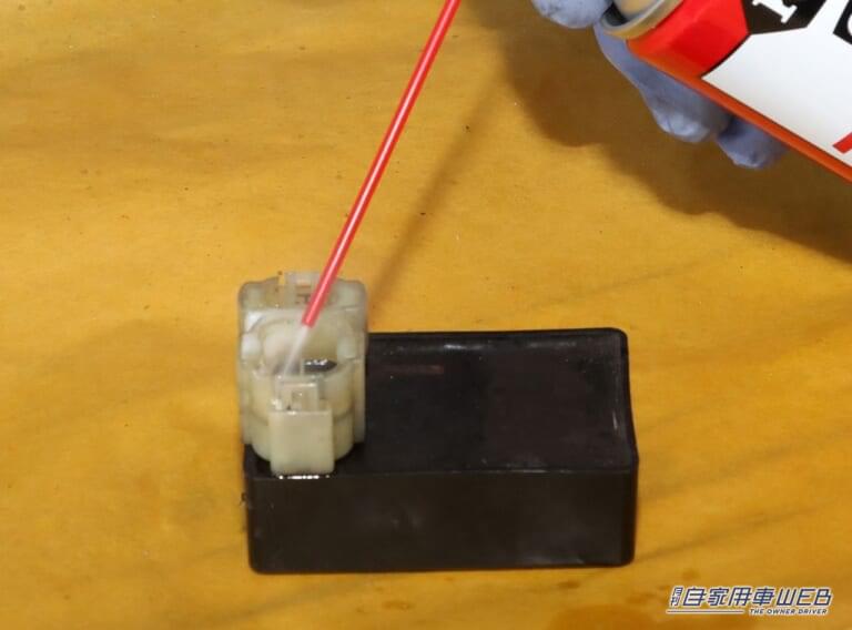 ECUやリレー類など、電装パーツを保管するときには、端子部分が腐食しないように、汚れや水分などを除去してから、接点復活剤をスプレーしておく。