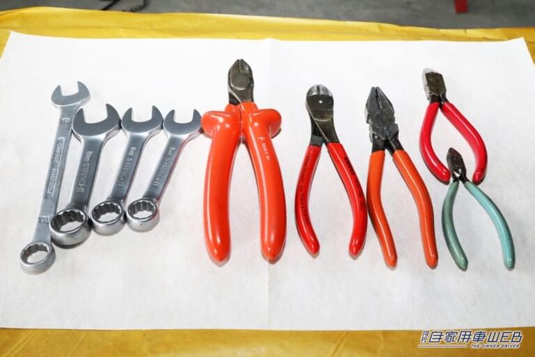 錆の酷いツールは錆び取り剤を使い、錆と汚れを除去。ペンチやニッパーなどは可動部にグリスを注油してスムーズに動作するようにしておいた