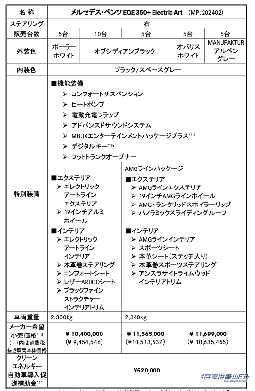 メルセデス・ベンツ日本は、 電気自動車「EQEセダン」に特別仕様車「EQE 350+ Electric Art」を追加導入。全国のメルセデス・ベンツ正規販売店ネットワークを通じて予約注文の受付を開始した。価格は1040万円〜(限定30台)。ユーザーへの納車は6月を予定している