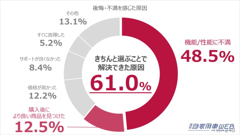 カーナビ購入者の4 人に一人が「カーナビ購入後に後悔したことがある」と回答。その理由を聞いたところ、約半数の方が「機能や性能」に不満を感じていた。次に「購入後により良い商品を見つけた」の回答も多いことから、後悔されたユーザーの多くが、しっかりカーナビを選ぶことなく購入されている状況が分かる。